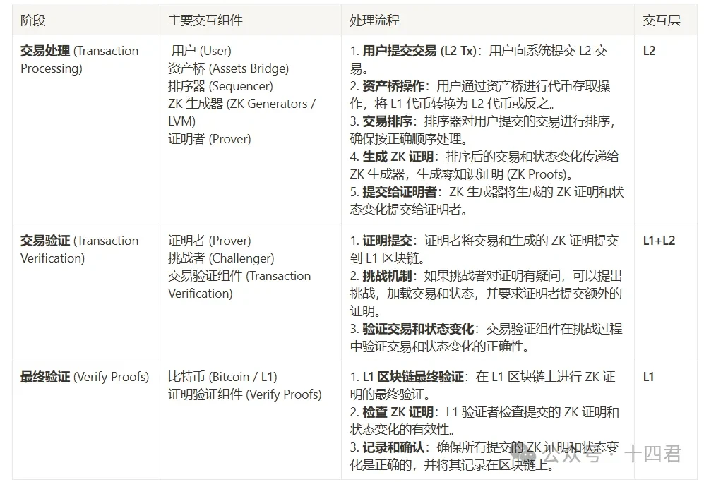可以看到 Bitlayer 的业务流程主要可以划分为三个阶段,分别是交易处理阶段、交易验证阶段、最终验证阶段。每个阶段交互的组件与其大致的处理流程如下表所示:
