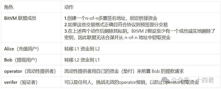 传统的 BTC L2 方案一般是通过多签的形式进行公共资金池管理,这种方案显然存在信任风险。而 BitVM 桥采用的是类似闪电网络的思想, 预指定资金可以被谁拿走 。当用户把资金锁到公共资金池的时候,会与联盟进行通讯,使得资金锁在一个 Taproot 地址上,只能由 Operator 领取,Operator 只有在垫付完成,提供自己垫付的证明到链上,并且被挑战无误后,才能解锁相关的资金。