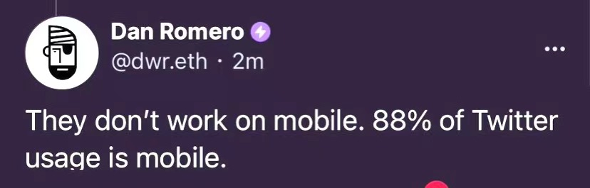 1) 移动端适配问题:正如 Farcaster 的创始人所指出的,“SOL Blink 目前在移动设备上的运行存在困难。考虑到约 88% 的 Twitter 用户主要通过移动设备访问平台”。