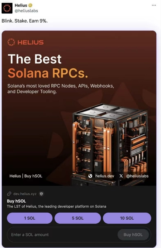 想象一下,你正在使用 X 平台,刷你的信息流。突然,你看到一条推文,上面有个购买 NFT 的页面, 下面有个按钮写着"Blink"。你心想,"哇,这么简单就能买 NFT 吗?"没错,这就是 SOL Blink 带来的神奇体验。