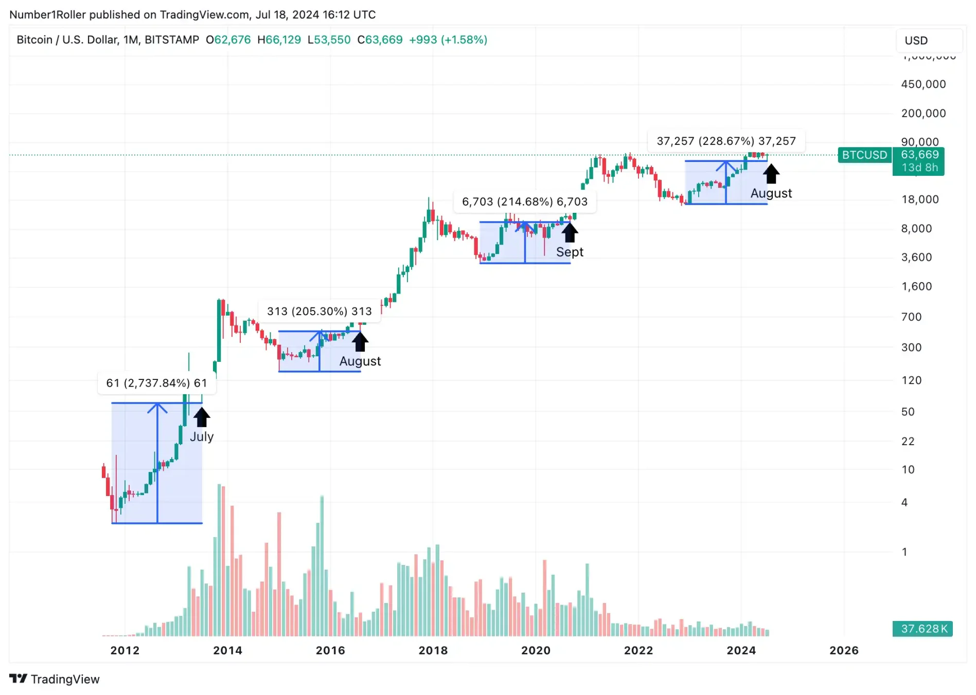 现在我们知道时间站在我们这边,但很多人认为这个周期不同,因为价格快速达到历史新高。不过让我们把当前周期与之前的周期在月线图上做个比较。