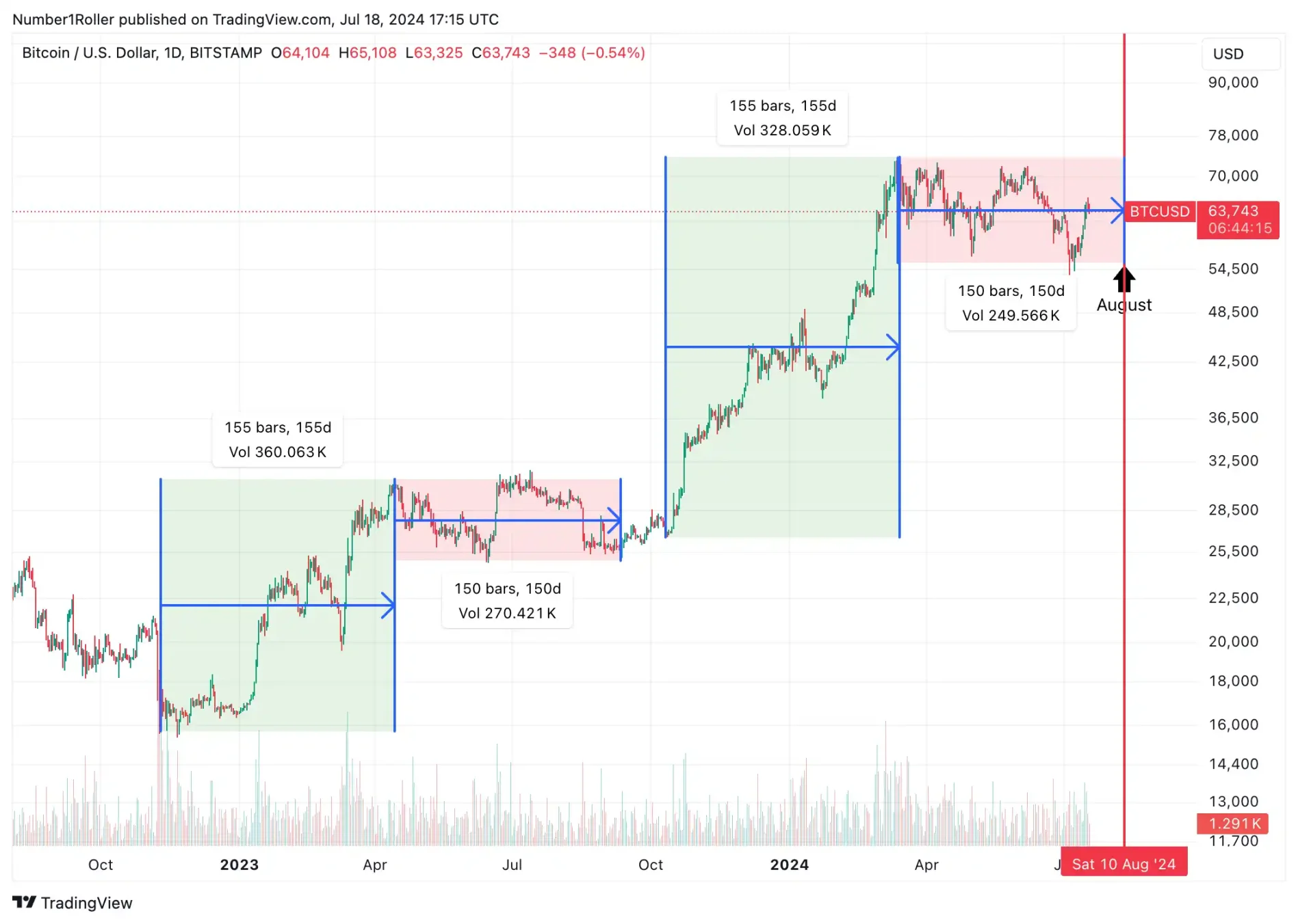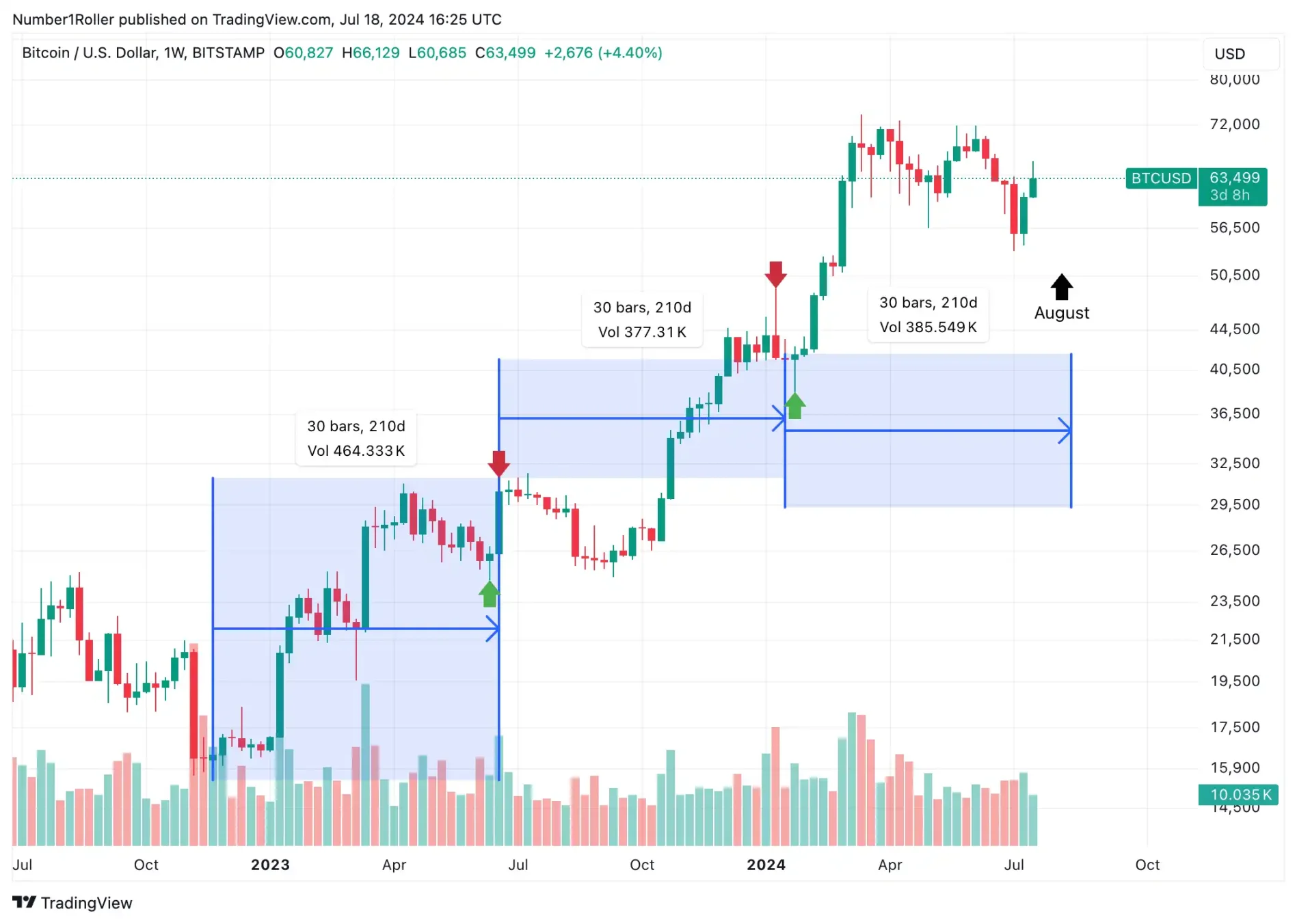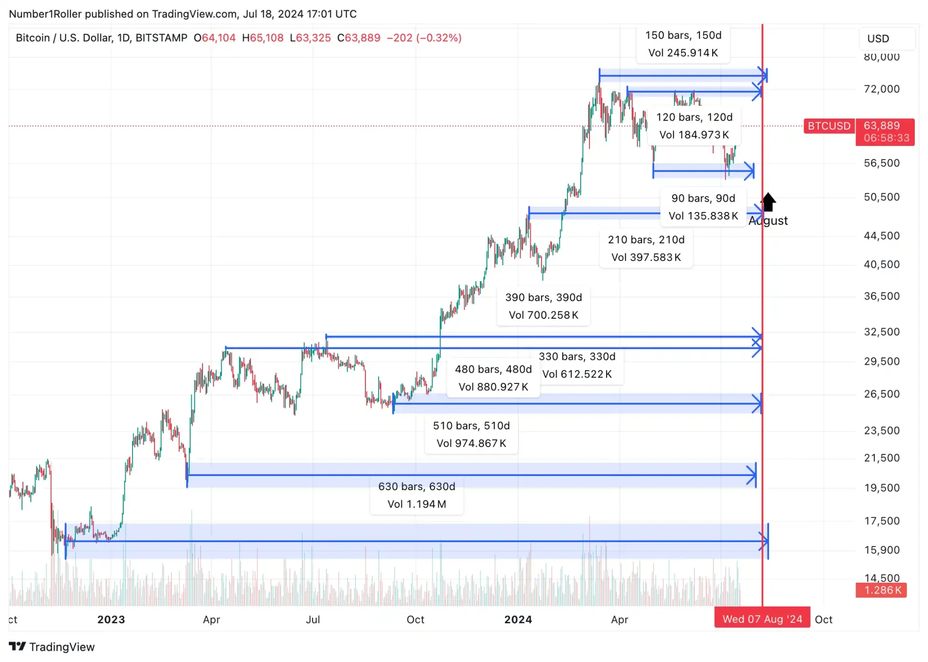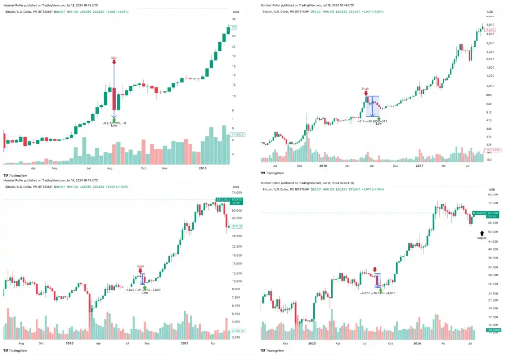 编者按:Digital Asset Research 通过详细的时间范围、价格范围以及时间角度等多方面的数据,展示了 8 月 6 日至 12 日可能出现重大事件或新闻的高概率。文中还将当前市场周期与之前的周期进行对比,指出市场趋势变化的时间规律,并结合月度和周度图表分析,提供了充分的证据。