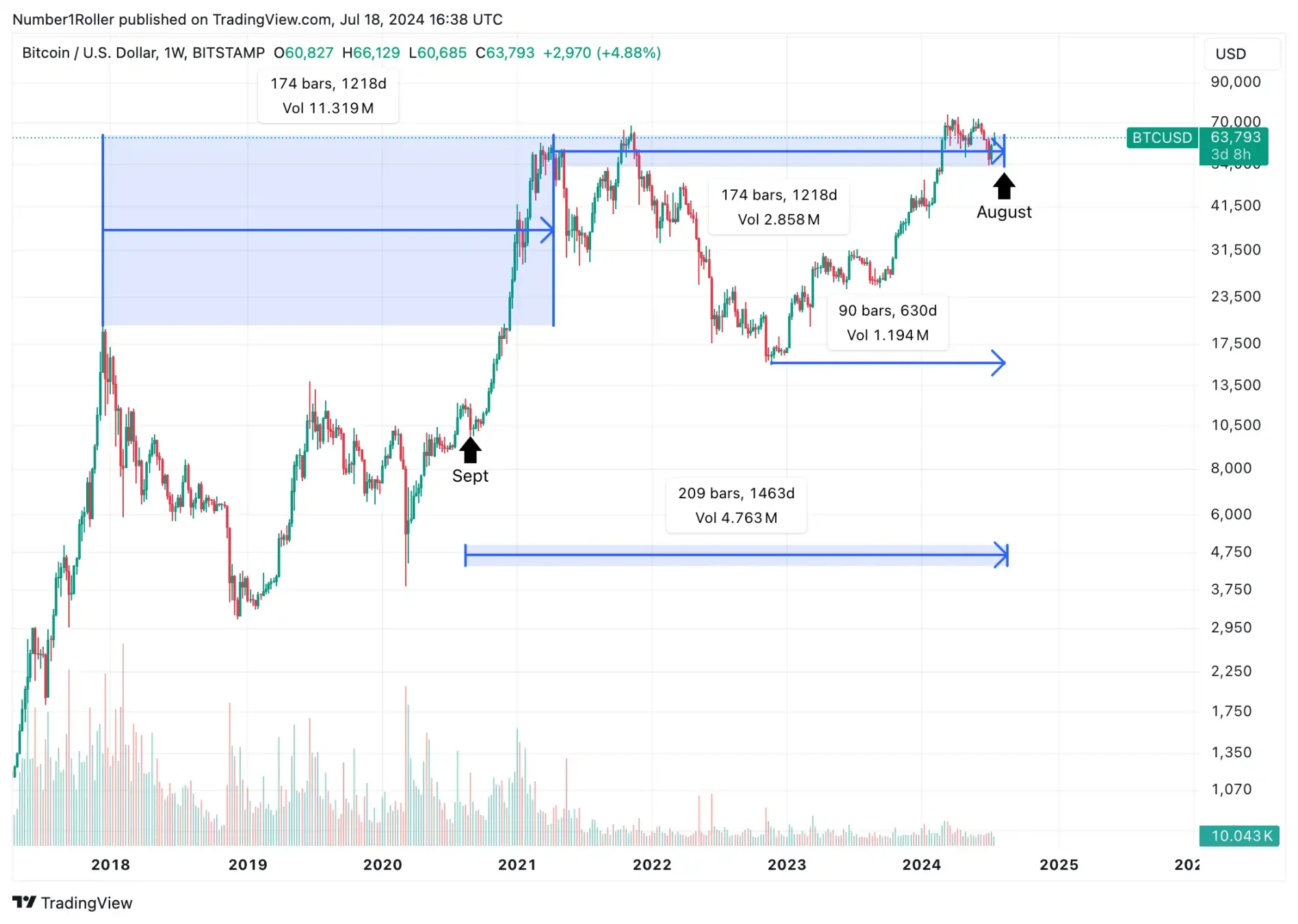此外,再把周线图放大一些。我注意到,从 2017 年的高点到 2021 年的第一个显著高点是 174 周。8 月 12 日将是从 2021 年 4 月那个显著高点起的 174 周,毫无疑问,这是一个重要的高点。因此,我们正接近两个重要拐点之间的相同时间段,即 2017 年的高点和 2021 年 4 月的高点。