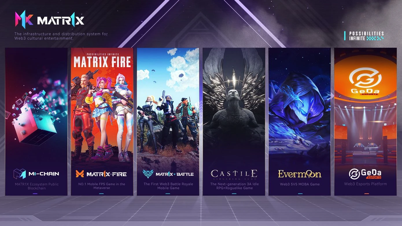 MATR1X 己拥有 MATR1X FIRE、MATR1X BATTLE、Castile、Evermoon 四款 3A 级游戏,MATR1X FIRE 是经典射击手游,MATR1X BATTLE 是大逃杀类吃鸡手游,Castile 是 3A 放置类卡牌,Evermoon 是 5 V 5 MOBA.