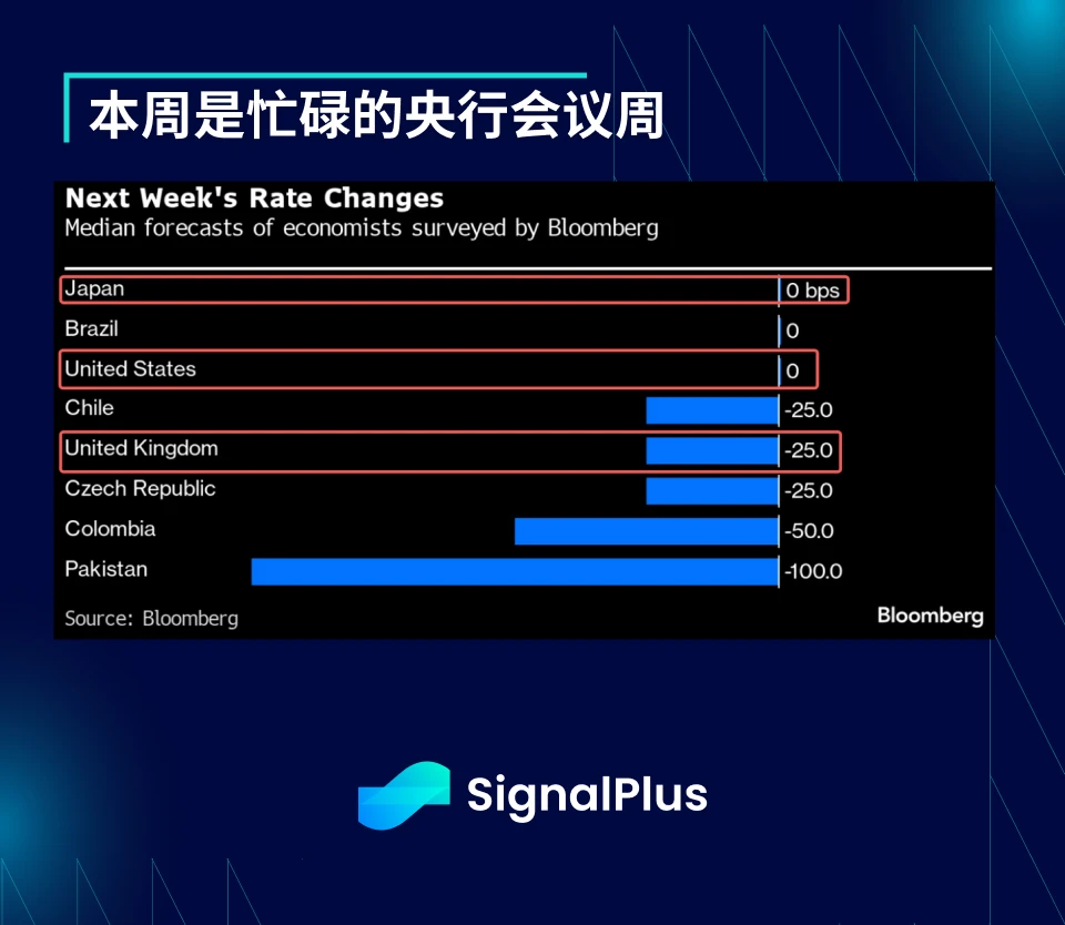 除了美联储之外,本周将有两个主要央行会议:日本央行和英国央行。市场普遍预期日本央行将维持利率不变,但会进一步减少购债规模,以允许长期收益率进一步上升。另一方面,市场预期英国央行将降息 25 个基点,但 Bloomberg 调查的 32 名经济学家中,有 8 人预期将维持利率不变。这两个央行会议都有可能出现意外,预计本周利率波动会增加。