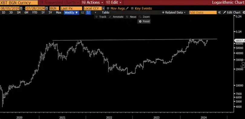 本月,德国抛售 BTC 的利空消息被消化之后,市场因川普遇刺以及美国大选而戏剧性开始上涨。从月中的 5.8 万美元升至 6.8 万美元附近,在川普为大选宣布各类比特币相当利好观点后,市场一度回落。但没过多久,利率市场普遍预估美联储会在 9 月进行年内首次降息,BTC 现货 ETF 数据持续净流入,一系列消息利好影响下,BTC 随后便再次开始向上冲击,就在 BTC 突破 7 万美元,距离 3 月份创下的 73777 美元历史高点近在咫尺之时,市场再度受挫走势向下,BTC 价格创新高为什么这么难?