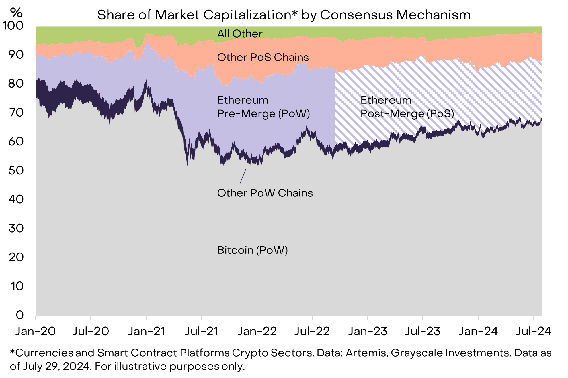 尽管按市值计算,比特币仍然是最大的公共区块链,但 PoS 网络已越来越受欢迎。例如,我们的 货币类别 和 智能合约平台类别 中超过一半的协议都使用 PoS 共识机制。按市值计算,基于 PoS 的区块链约占这些加密资产类别总市值的 30%,占除比特币以外的总市值的 90%(图表 1)。