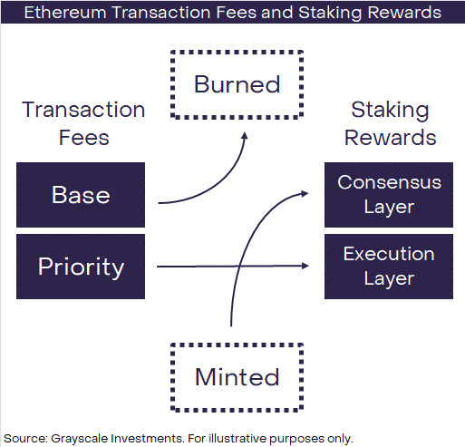 通过提供这些服务,质押者将获得代币奖励,这些代币来自用户支付的费用和新发行的代币。在以太坊上,费用分为基本费用和优先费用(小费)。网络会自动销毁基本费用部分,旨在通过减少代币供应量使所有用户受益。质押者除了新发行的 ETH 外,还能获得用户在交易中支付的优先费用(图 3)。