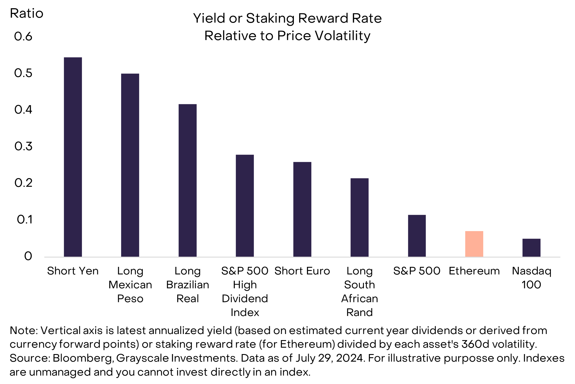 图 6:与其它波动性资产相比,以太坊的质押收益率较低