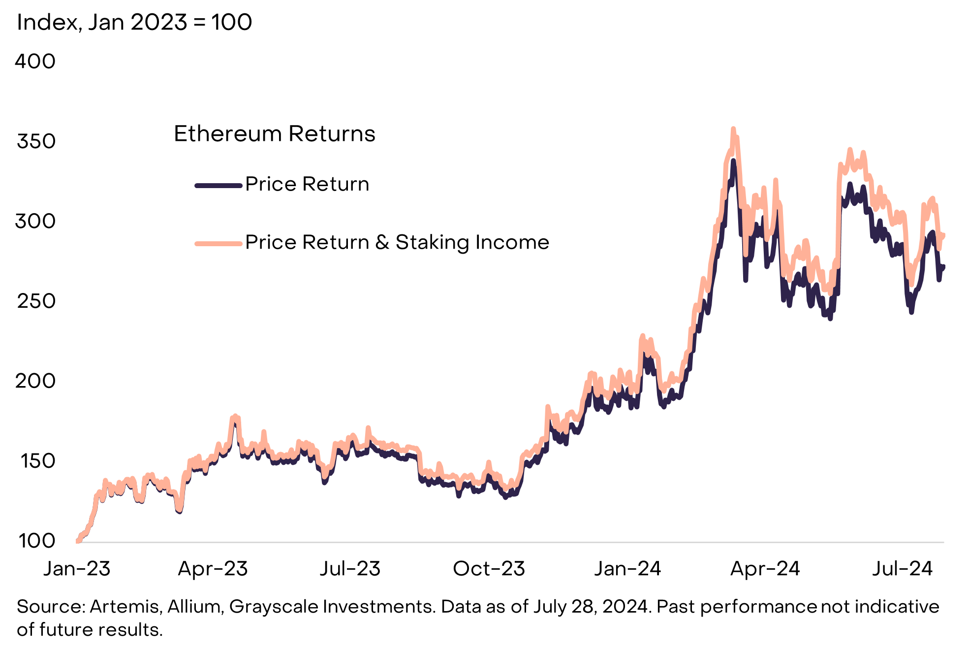 对于质押代币并提供验证服务的以太坊持有者来说,质押奖励可以被视为一种收入来源。例如,自 2023 年初以来,ETH 现货价格上涨了 173%。在此期间,我们估计质押奖励年化约为 4.5%。因此,以太坊质押者的回报率(包括价格回报和质押收入)将达到 192%(图表 5)。但前提是质押者正确履行了其职责(即获得所有奖励且没有遭遇罚没)并且没有支付任何第三方费用。