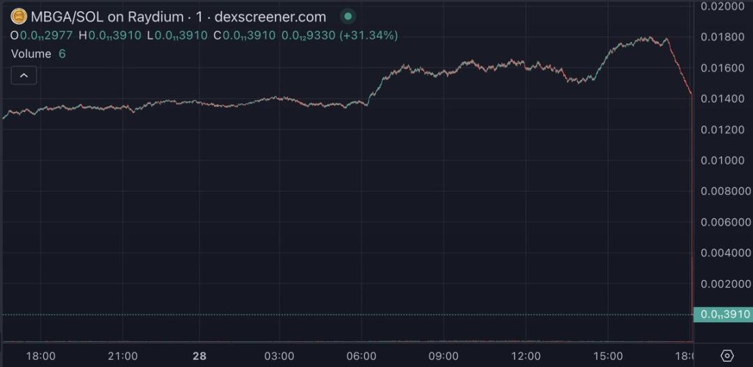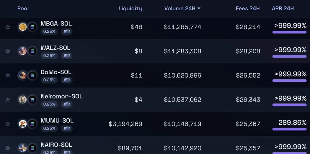 每个低流动性池背后都是在一个在过去 24 小时内跑路(rugged)的项目。以 MBGA 为例,在过去 24 小时内,Raydium 上发生了 46, 000 笔交易,交易量达 1, 080 万美元,有 2, 845 个独立钱包进行过买卖,并产生了超过 28, 000 美元的交易费用。(请注意,类似规模的合理的流动性池,比如 MEW,仅产生了 11.2 K 笔交易)