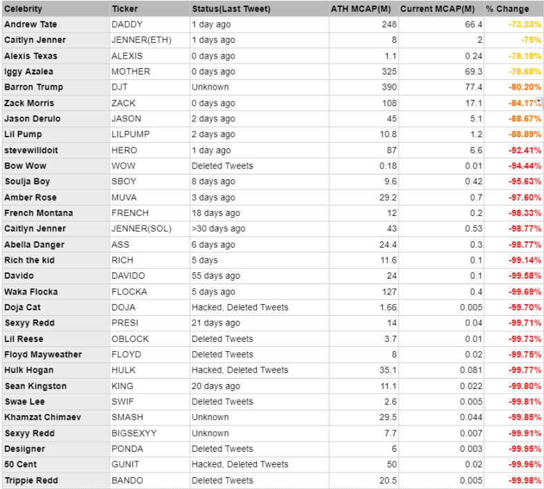 除了 rug 和 MEV,散户交易的前景依旧暗淡。名人们选择 Solana 作为他们发行 Memecoin 的首选链,但结果并不乐观: