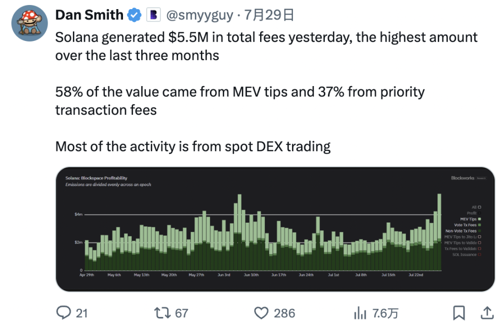 考虑到异常高的交易数量 / 用户比率,以及链上虚假交易、欺诈交易的数量,可以断定 Solana 上绝大多数交易都是非有机的。以太坊 L2 上每日交易数量与用户比率最高的是 Blast(为 15),Blast 费用同样低廉,而且用户正在耕种第二季空投。粗略比较一下,如果我们假设真实的 Solana 交易数量 / 用户比率与 Blast 相似,那就意味着 Solana 上超过 93% 的交易(以及费用)都是非有机的。