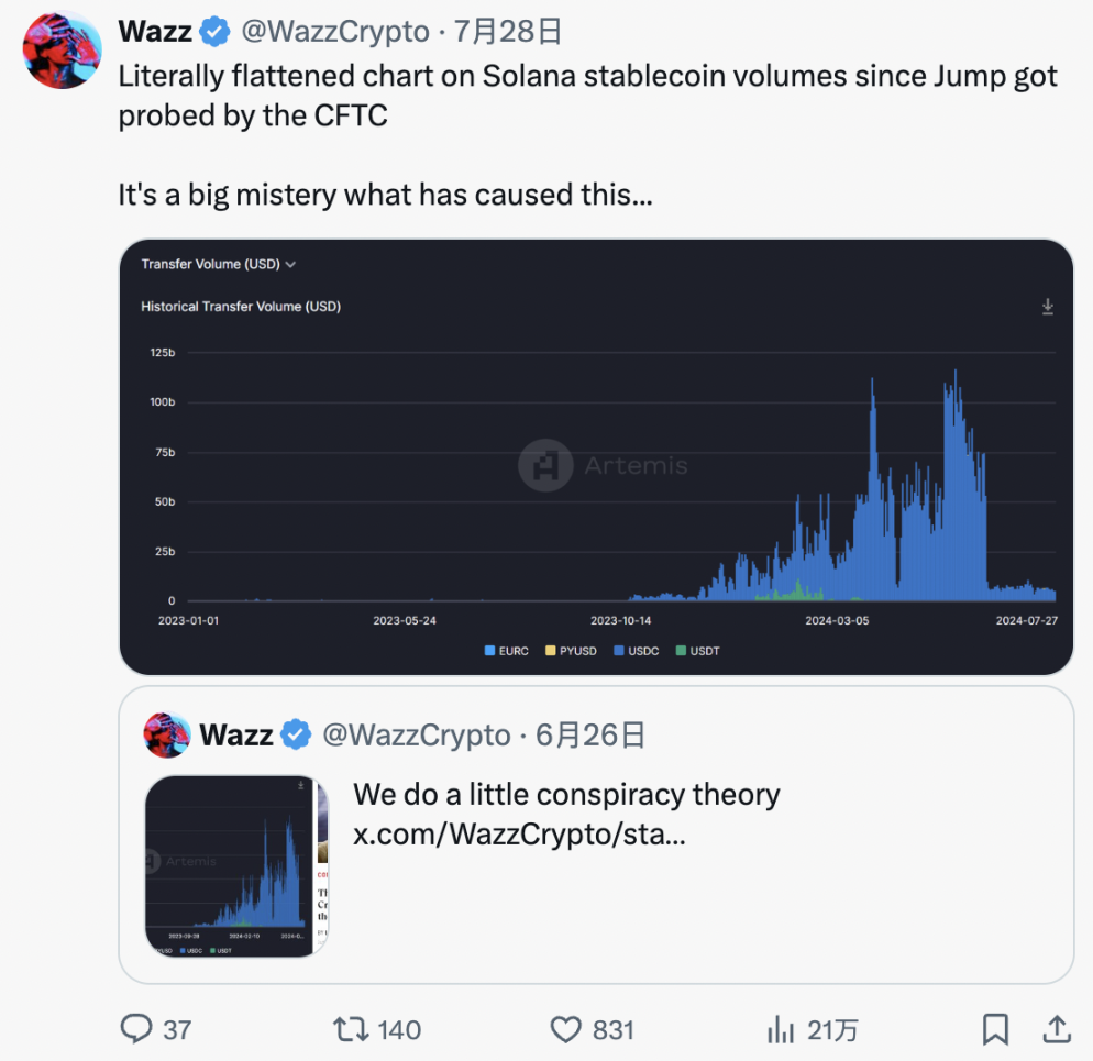 我认为,稳定币 TVL 是一个比低费用平台上的交易量和手续费收入更难操控的指标。稳定币交易量动态证实了这一点:@WazzCrypto 注意到 CFTC 宣布调查 Jump 后 Solana 上稳定币交易量突然下降: