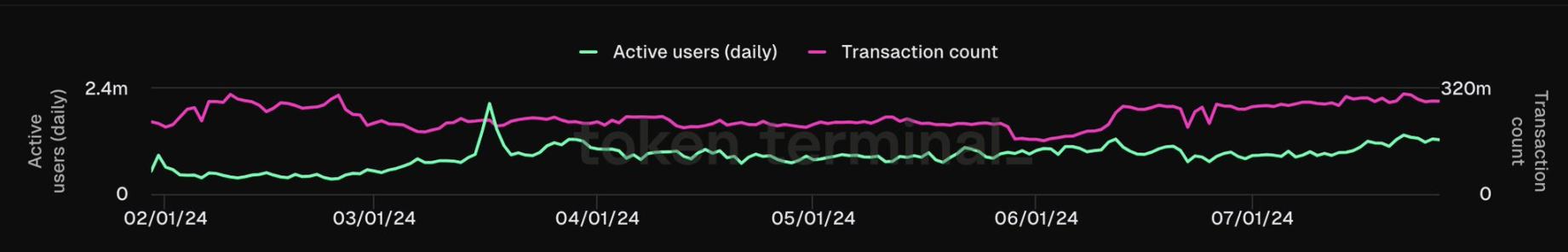 从表面上看,Solana 的数据看起来不错,每日活跃用户 (DAU) 超过 130 万,而以太坊则为 376, 300 。然而,当我们结合交易数量一起分析时,就会发现一些奇怪的现象。 例如, 7 月 26 日,以太坊的交易数量为 110 万,而 DAU 为 37.63 万,平均每位用户的交易数量约为 2.92 笔。而当天 Solana 的交易数量为 2.822 亿,DAU 为 130 万,平均每位用户的交易数量高达 217 笔。我认为这或许是因为 Solana 费用低廉,可以进行更多、更频繁的交易,以及套利机器人活动的增加等。因此,我将其与另一条流行的廉价链 Arbitrum 进行了比较。然而,Arbitrum 在同一天平均每位用户的交易数量只有 4.46 笔。如果查看其他链的数据也可以得到类似的结果: