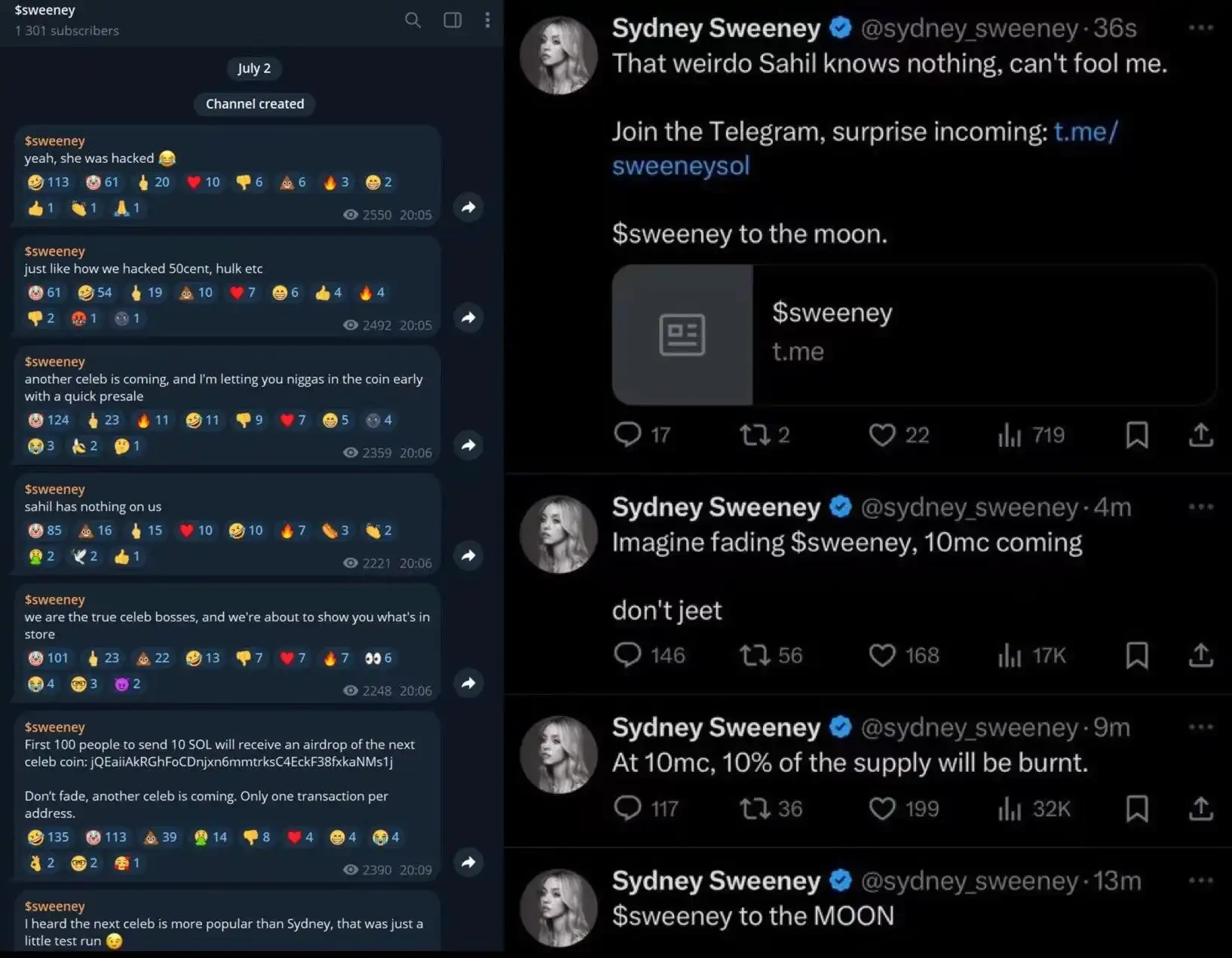 7 月 2 日,Sydney Sweeney 的账号遭遇 SIM 卡 Swap 攻击,随后在其账号上发布了一个 meme 币链接,导致该币价格急剧上涨然后暴跌。