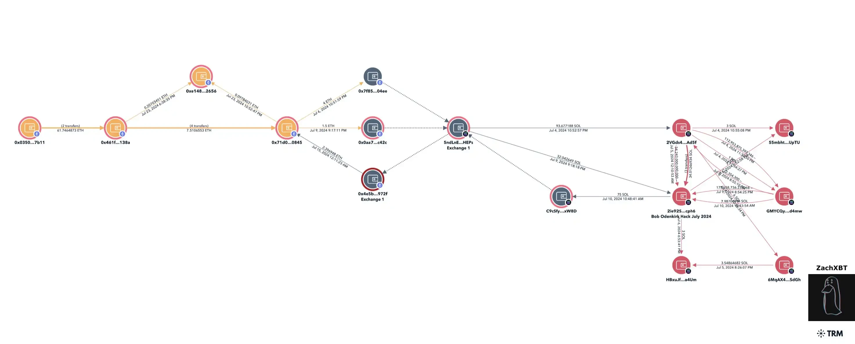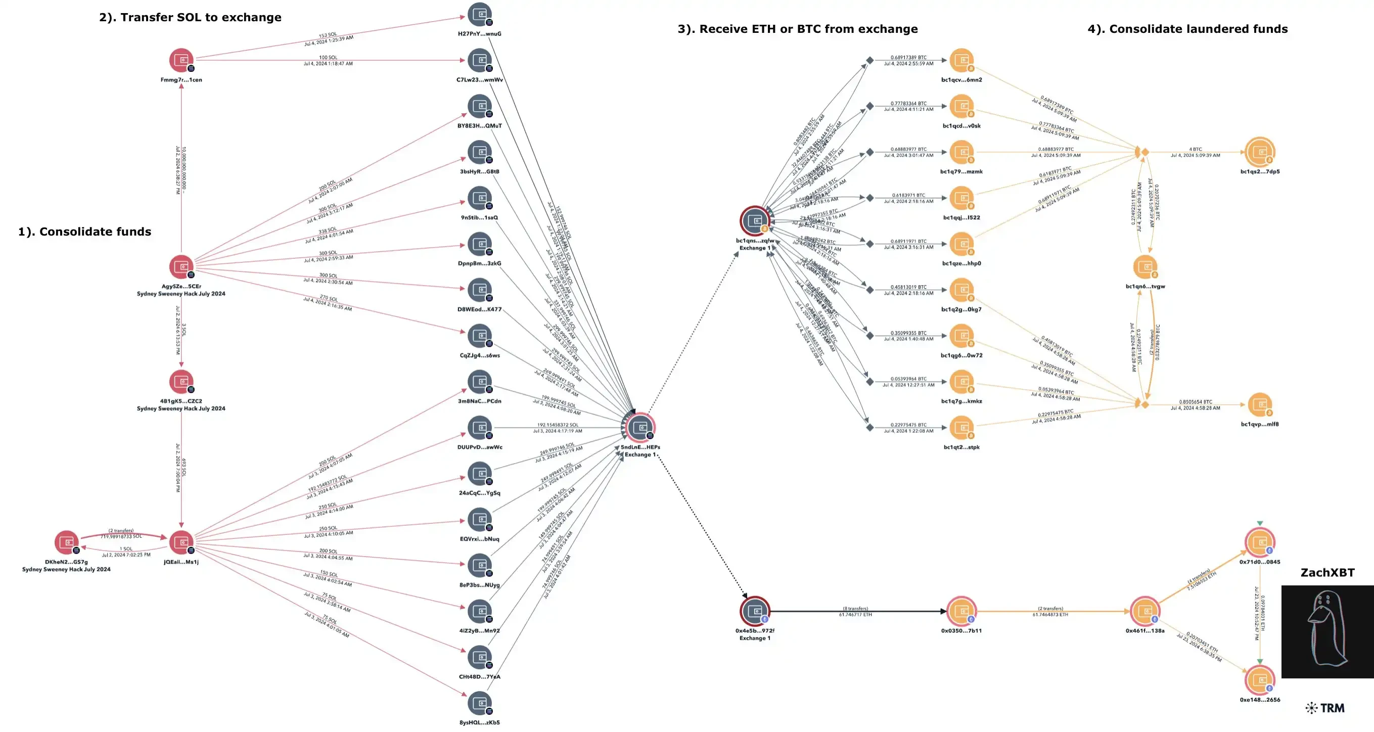 通过时间分析,我们可以看到骗局所得款项首先被转入 Solana 上的一个交易所,然后被兑换成比特币和以太坊。