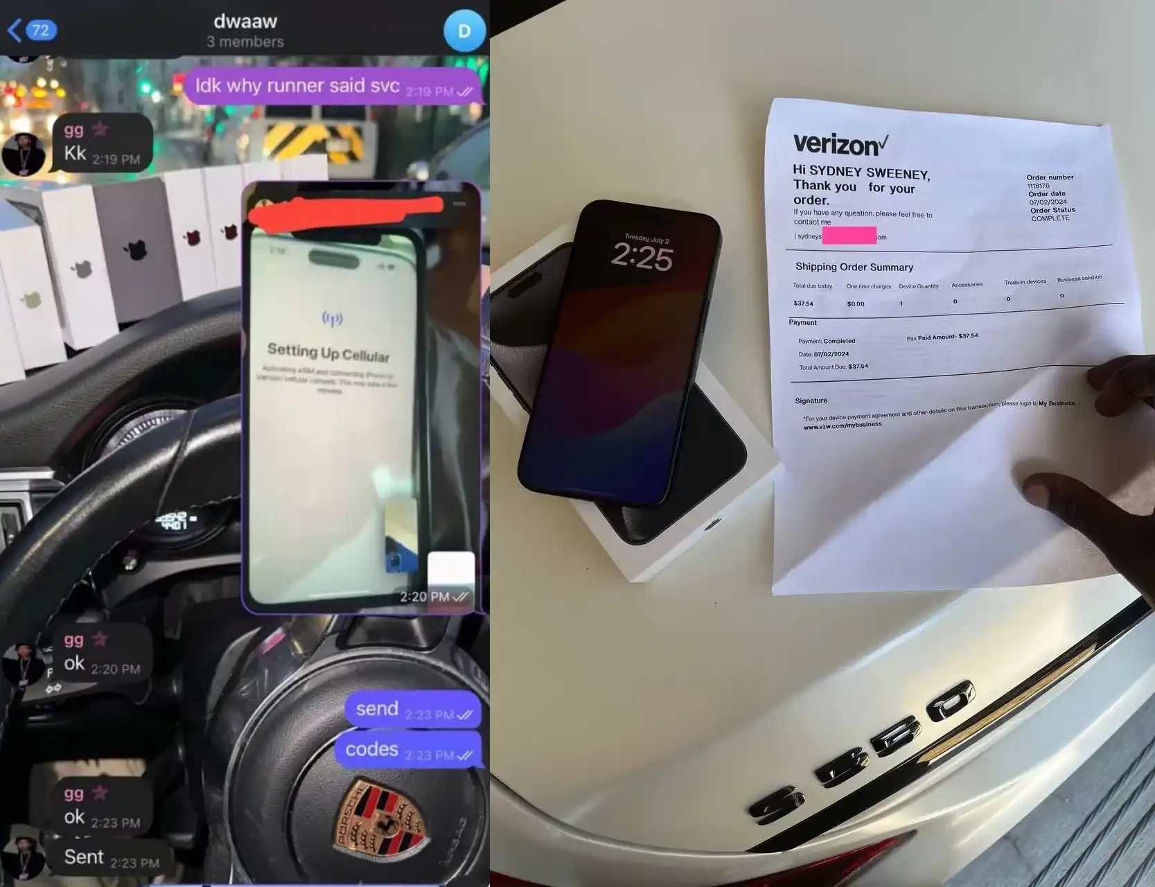 事发后,网上出现了 Gurv 在 Telegram 上接收登录 Sydney Sweeney 账户的代码截图,这些代码是通过 SIM 卡交换获取的。此外,还附有一份来自 Verizon 的收据,显示了 Sydney Sweeney 的 SIM 卡交换记录。