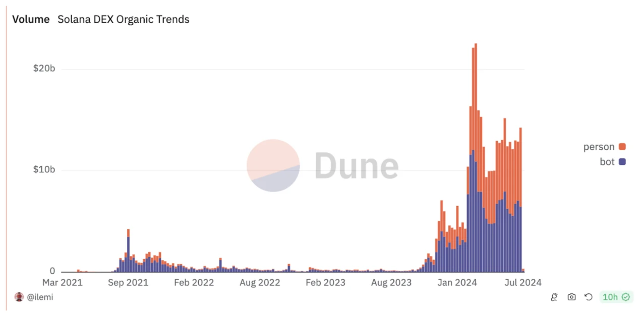 值得注意的是,DEX 的交易其中大约 50% 都是由 MEV bot 发起的,主要是其低廉的费用和 Meme 交易活跃滋生了 MEV 的有利可图。而这也是导致用户高峰交易失败频发、宕机的主要原因之一。