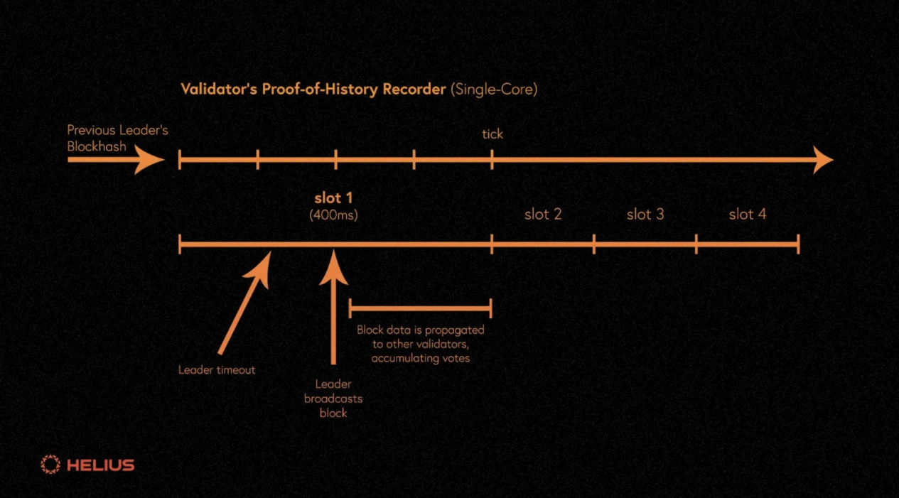 为了避免 Leader 节点处产生单点故障,因此引入了时间限制。在 Solana 中时间单位是以 epoch 进行划分,每个 epoch 包含 432 , 000 个 slot(时隙),每个 slot 持续 400 ms,在每一个 slot 中,轮换系统会在每个 slot 内分配一个 Leader 节点,Leader 节点必须在给定的 slot 时间内发布区块(400 ms),否则,就会跳过这个 slot,重新选举下一个 slot 的 Leader 节点。