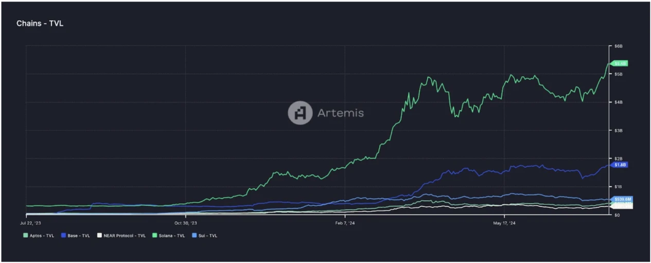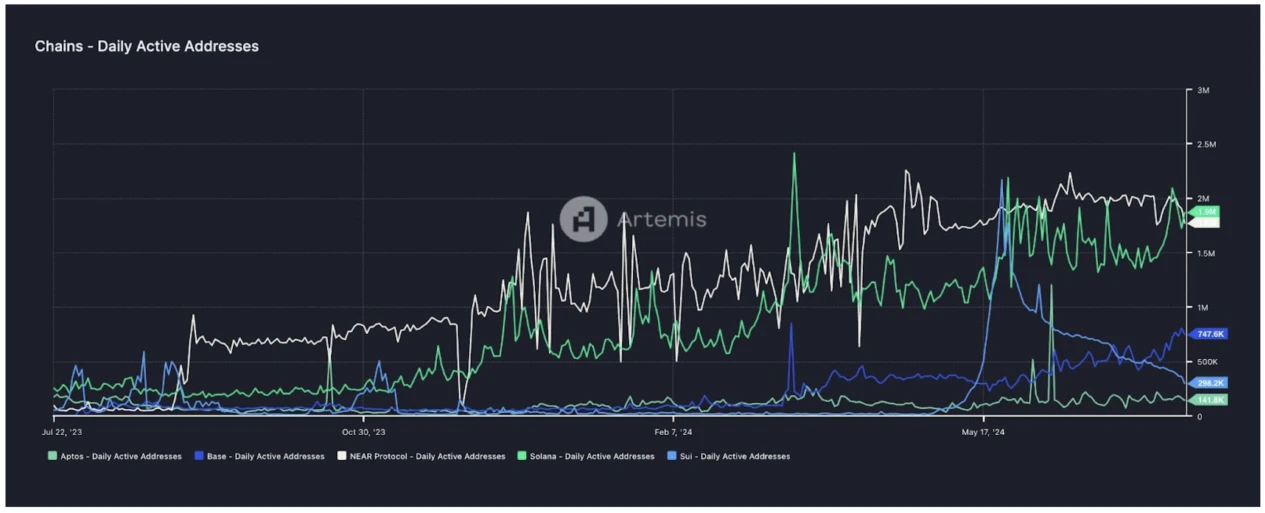 在一众公链中,Base 被视为 EVM 生态潜在的 Solana 竞争对手。Base 的链上活跃地址数正在迅猛增加,而 Solana 在具备先发优势的情况下,也仍处于高速增长的阶段。NEAR 维持高位不变,但是 Aptos 以及 Sui 在公链的竞争中落后。