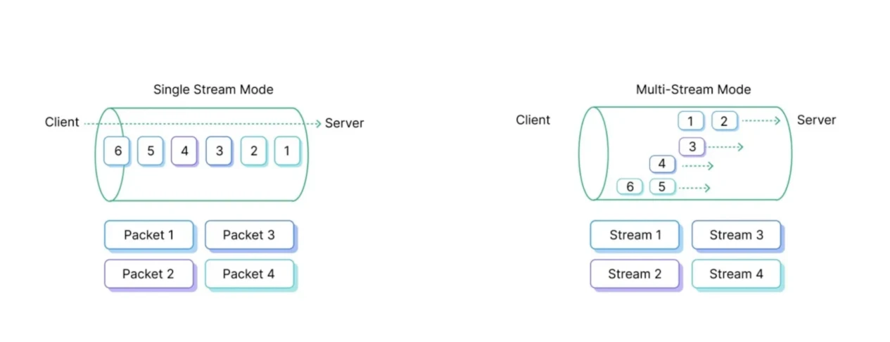 TCP 可靠性高于 UDP,但是 UDP 的速率高于 TCP,因为 TCP 会在包丢失的时候具备拥塞控制机制,重新传输丢失的包。UDP 速率高,可靠性低,Goggle 希望构建一个可靠性高且速率高的传输层协议 QUIC。QUIC 最核心的特性就是相互独立的逻辑流。它允许在单个连接上并行传输多个数据流,并且每个流可以独立地处理。相比之下,TCP 只支持单数据流,需要按照发送顺序接收和确认每个报文。