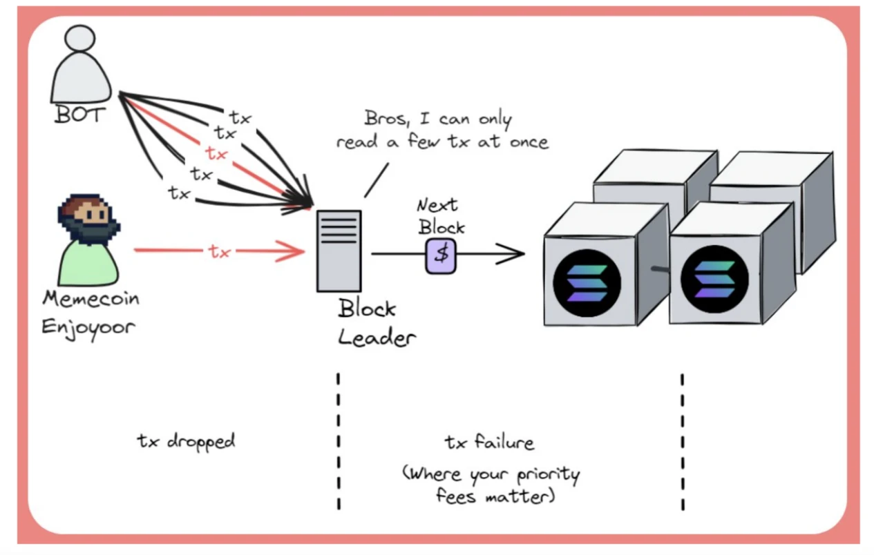 Solana 宕机的主要原因就是使用了该 QUIC 实验性应用层协议,由于 UDP 以及多路传输的快捷,并且希望保持完整数据的传输,因此其也会设计机制来对丢包情况进行多次重传。Leader 节点在接收多个交易时,是通过 QUIC 协议开启多个通路进行的,但是 Leader 节点毕竟是一台计算机,尤其能够处理的交易容量上线,因此在发生大量的交易涌入时,Leader 节点就会切段某些通路连接,这就会导致交易被 drop。如何选择将被切断的连接并没有一套既定的标准(比如切断所有费用低于 xxx 的连接),所有连接是否会被切断都是随机性的。因此这就导致了存在一定黑箱操作的空间,Leader 节点可能更倾向于有利可图的 MEV 交易,而放弃用户的低价值交易。