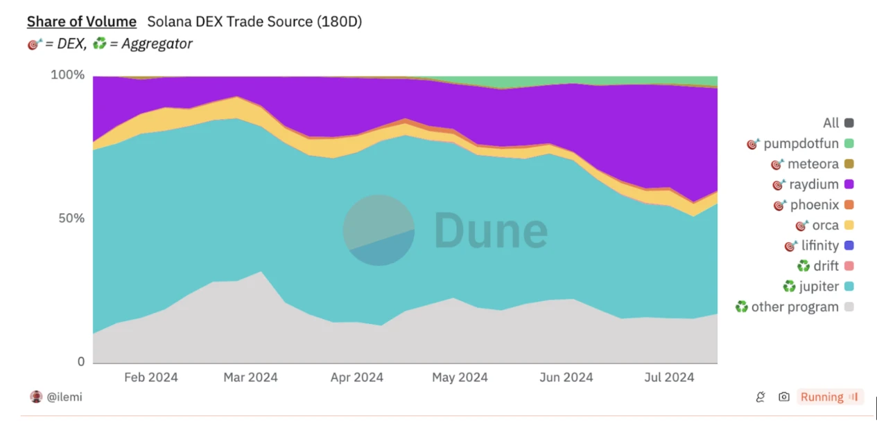 当前在整个 DEX 方面竞争激烈,其龙头也经历了多次迁移,从 Raydium,Orca 到现在 Jupiter 为主导地位。