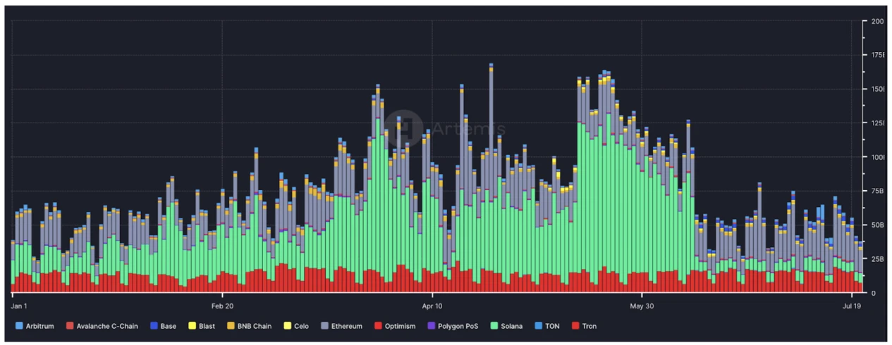 Solana 在上半年具有引人瞩目的稳定币转账的市场份额。但是从 6 月份之后,其市场份额显著下滑。上半年 Solana 表现的绝对亮眼,但是其在下半年的开端转账数据有明显下滑的趋势。