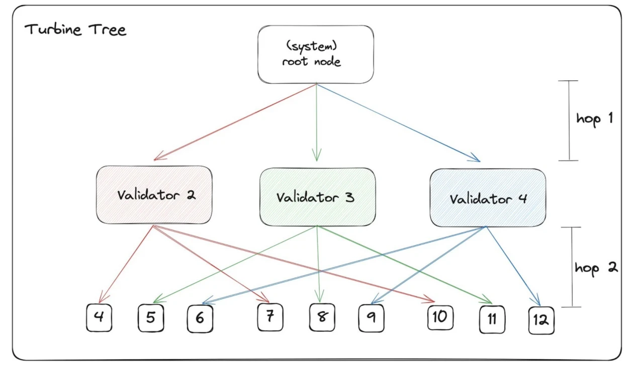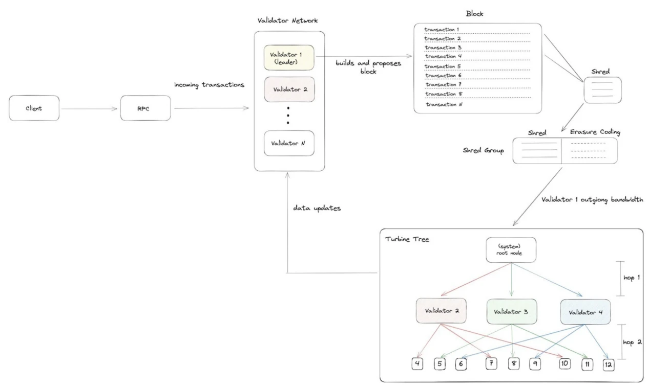 在 Solana 中,由于存在大量的验证者投票交易,并且由于 Leader 节点中心化带来的高效以及 400 ms 的 Slot 时间,这就导致了整体区块大小以及出块频率都特别高,大区块在传播时,也会给网络造成很大的压力,Solana 采用 Turbine 机制来解决大区块的传播问题。