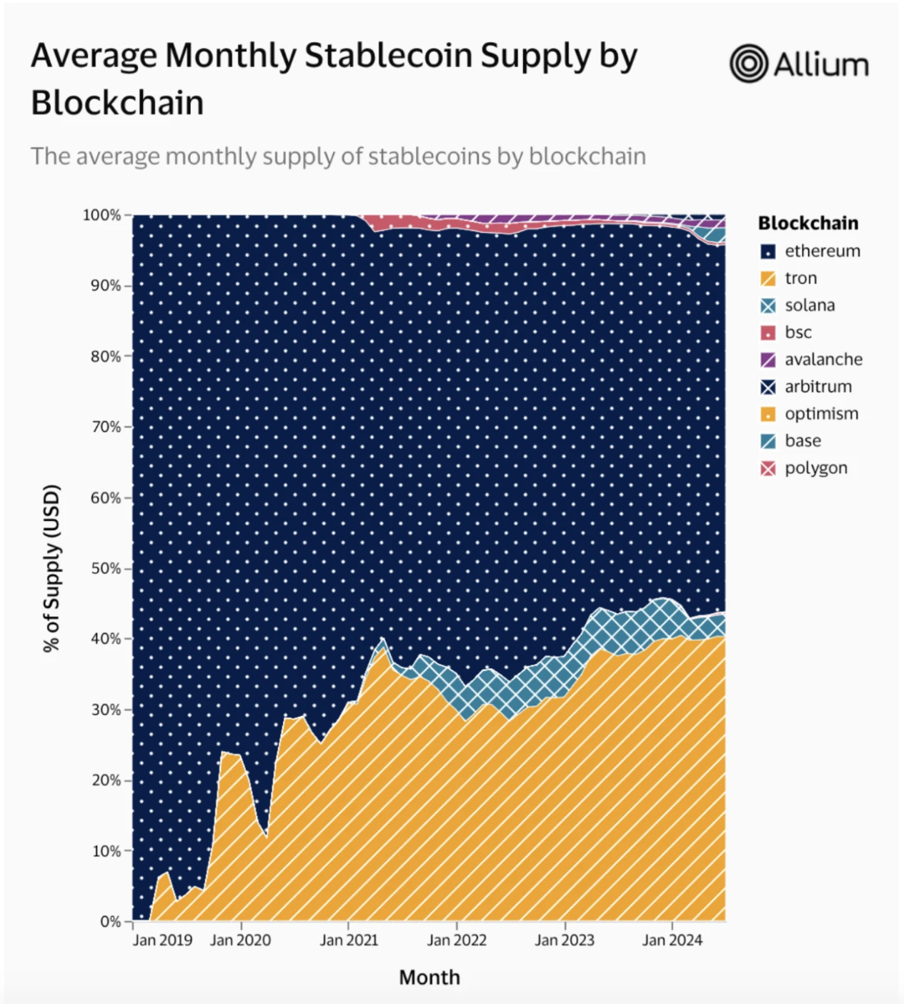 目前 Solana 的稳定币供应的市场份额一直萎靡不振,Ethereum 由于多链的出现,其市场份额自然缩小,Base 市场份额在悄然增加。