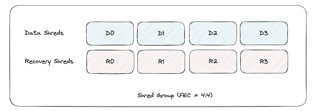 Leader 节点通过称为 Sharding 的过程将区块拆分为 shred 的子区块,其规格大小以 MTU(最大传输单元,无需将其分割成更小的单元即可从一个节点发送到下一个节点的最大数据量)为单位。然后通过使用 Reed-solomon 擦除码方案来保障数据的完整性以及可用性。