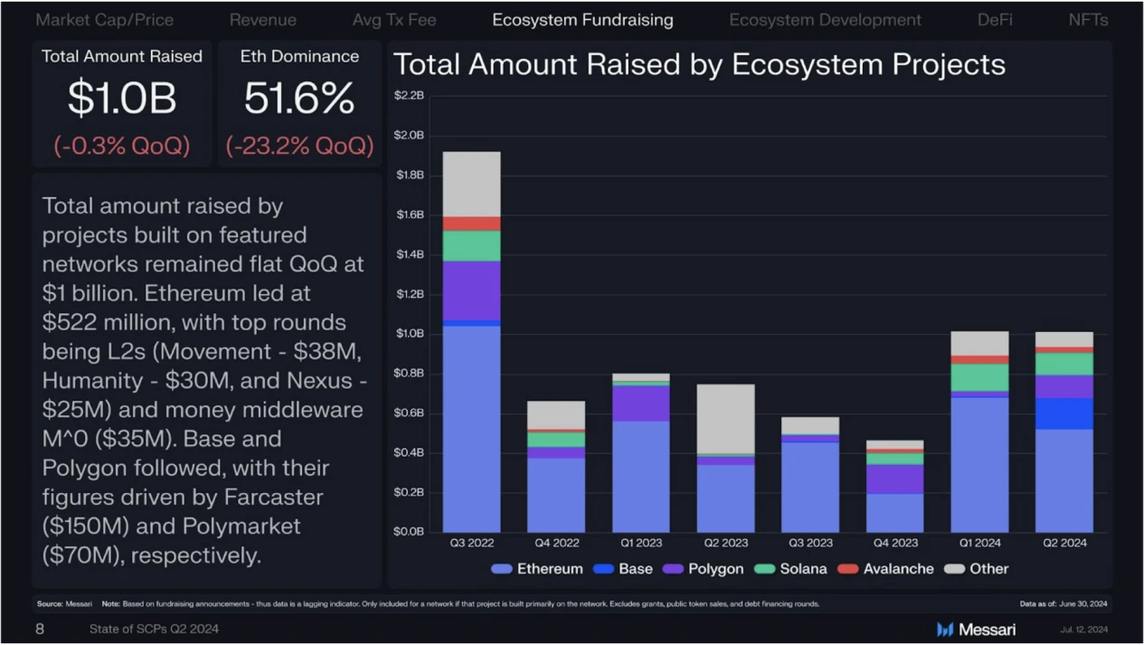 Solana 虽然在区块链行业中以其高吞吐量和低交易成本获得了显著的市场份额,但它也面临着来自其他新兴公链的激烈竞争。Base 作为 EVM 生态中的一个潜在对手,其链上活跃地址数正在迅速增长,同时,Solana 的 DeFi 领域总锁仓量(TVL)虽然创下了历史新高,但 Base 等竞争对手也在快速占领市场份额,Base 生态的融资额也首次在Q2季度超越 Solana。