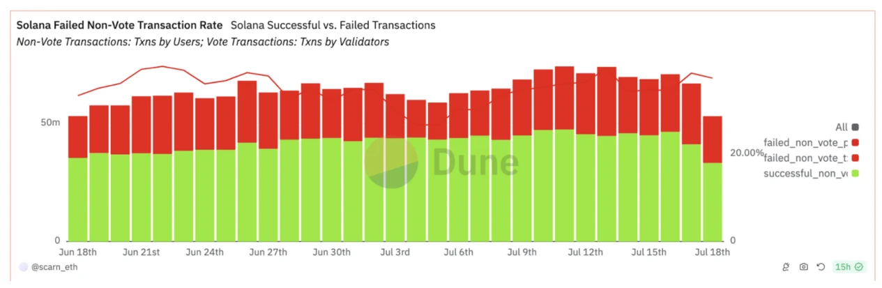 使用过 Solana 的用户应该知道,我们的交易很多时候都无法正常提交,过段时间以后,发现交易失败,这造成了极差的用户体验。如上图,根据统计,用户提交的交易中,其中有 35% 左右的交易是失败的,需要用户多次提交,而在链上有较大波动时,这一比例将更大。