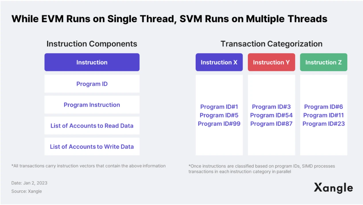 在 SVM 中,指令由 4 个部分组成,包含程序 ID,程序指令以及读取/写入数据的账号列表。通过确定当前账户是处于读取还是写入状态以及要进行状态更改的操作是否有冲突,可以将账户的交易指令中对状态没有冲突的并行化允许,每条指令以 Program ID 来表示。而这也是为什么 Solana 的验证者的要求很高的原因之一,因为要求验证者的 GPU/CPU 能够支持 SIMD(单指令多数据)以及 AVX 高级矢量拓展能力。