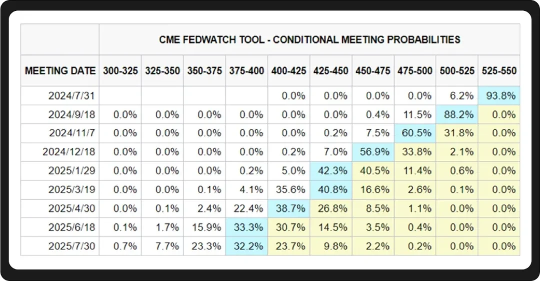长期的加息已经对美国经济造成了不小的冲击,目前市场都在猜测很多经济数据是美联储和美国政府相关部门在 “造势”,来营造出降息的合理性。当然,效果也非常好:目前 FedWatch Tool 显示, 9 月维持目前利率水平的概率为 0 ,换言之 9 月开始降息的概率是 100% !