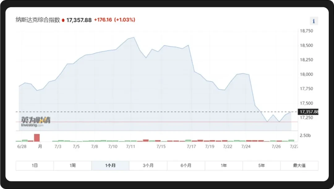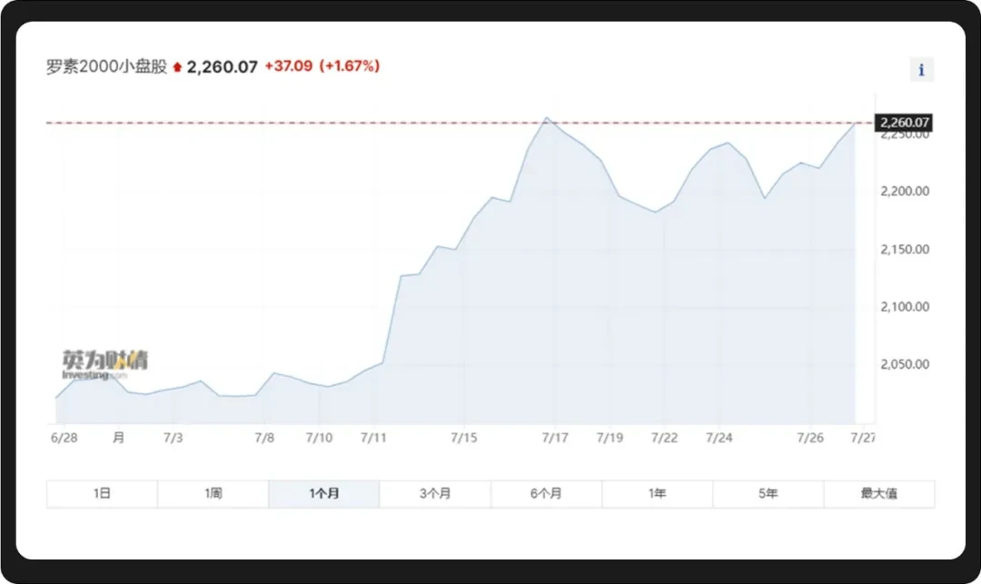 先来看一下罗素 2000 小盘股(RUT)与纳斯达克综指(IXIC)近一个月的走势变化图。这两个指数非常有趣: 7 月 11 日 IXIC 见顶之日,却是 RUT 腾飞之时。