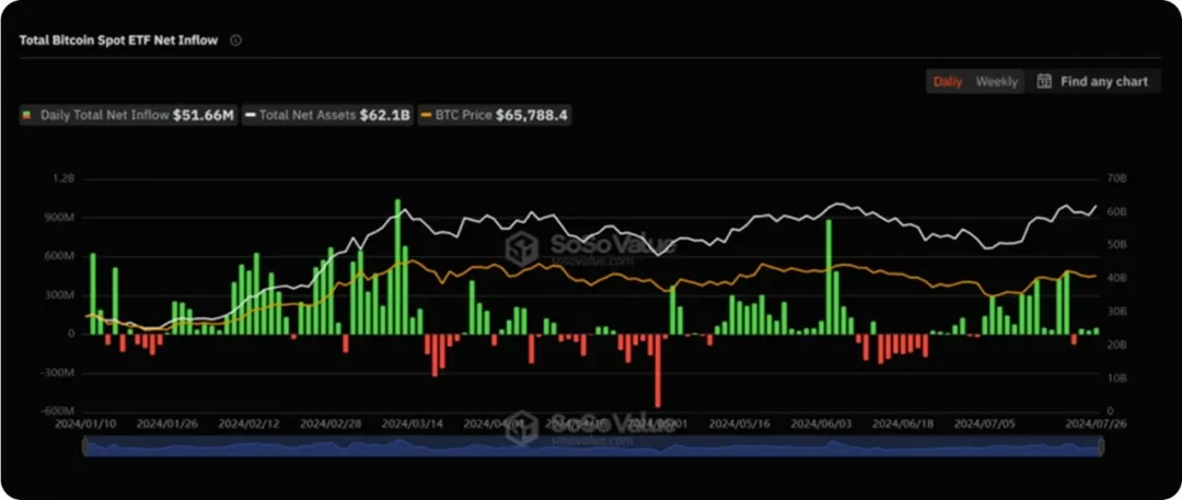 7 月由于 Mt.Gox 案件的赔付、德国政府的抛压和特朗普在 BitCoin 2024 上的讲话,市场带来了巨大的波动——比特币价格最低跌破了 54000 美元,随后又突破 7 万美元,然后又在月底回落至 66000 美元附近。近期比特币波动率指数达到了一个较高的峰值水平,这显示市场目前正处于多空双方势均力敌的阶段。