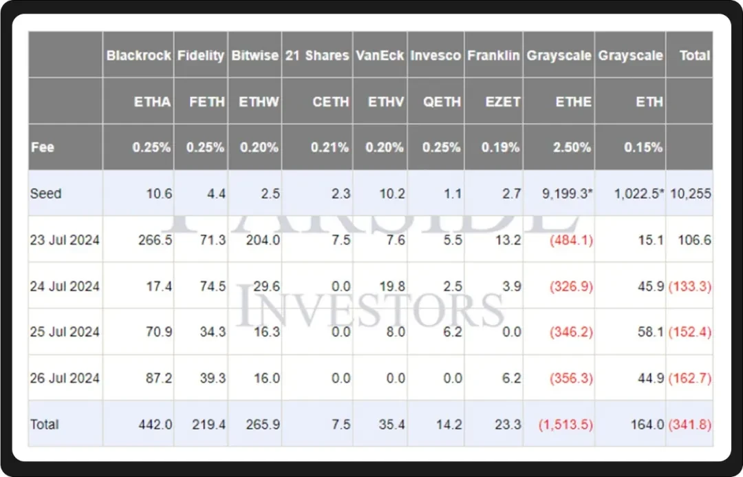 在比特币波动性引发热议的同时,以太坊市场也在本月迎来了它的里程碑时刻:美东时间 7 月 23 日,恰逢以太坊首轮公开发售十周年纪念日,以太坊现货 ETF 开始上市交易。然而,市场表现却相当平淡:Farside Investors 数据显示,开盘首日净流入超 1 亿美元,但是随后的几天出现了持续的净流出。