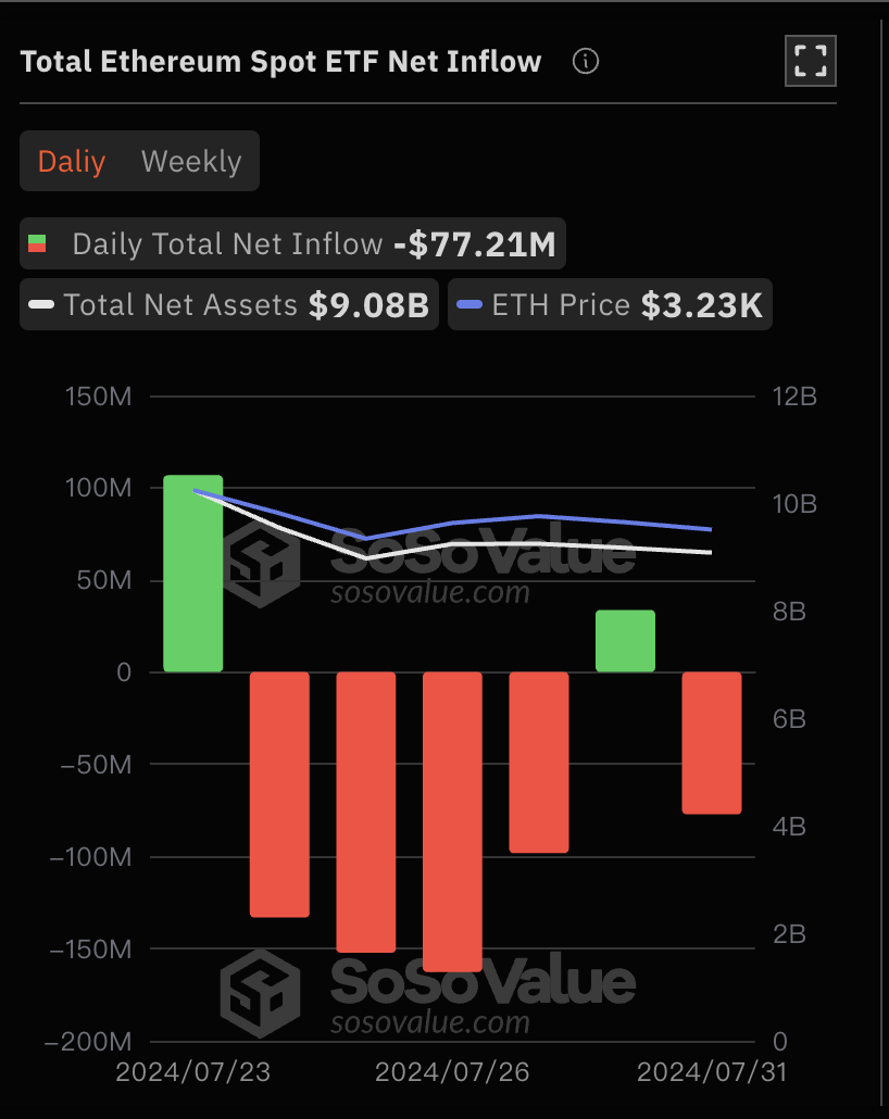 7月31日以太坊现货ETF总净流出7721.11万美元,ETF净资产比率达2.34%
