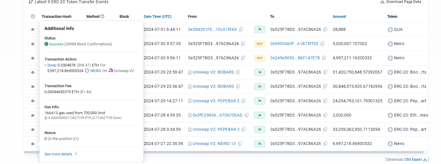 不过,PANews 追踪所查到的 Cointool 混币平台发现,这个平台的功能就包含批量生成钱包、批量转账及批量自动购买等功能。开发者可以轻松的利用这些功能伪装成数十个购买地址,并在同一时间买进。以0x 525 F 78 D 35 De 309 f 0 f 53311 C 5 A 69370597 AC 86 A 26 这个地址为例,花费约 100 美元购入 999.7 万枚 NEIRO 代币,目前价值约为 150 万美元,回报率约为 14925 倍。随后将代币分为两笔转至两个地址。截至 8 月 1 日,大多数的地址中的 NEIRO 代币仍未售出,一方面或许是为了不引起注意(毕竟目前持仓 0.5% 的金额也接近 75 万美元),另一方面,操作人员还未向这些分仓后的地址转入以太坊代币支付交易的 Gas。