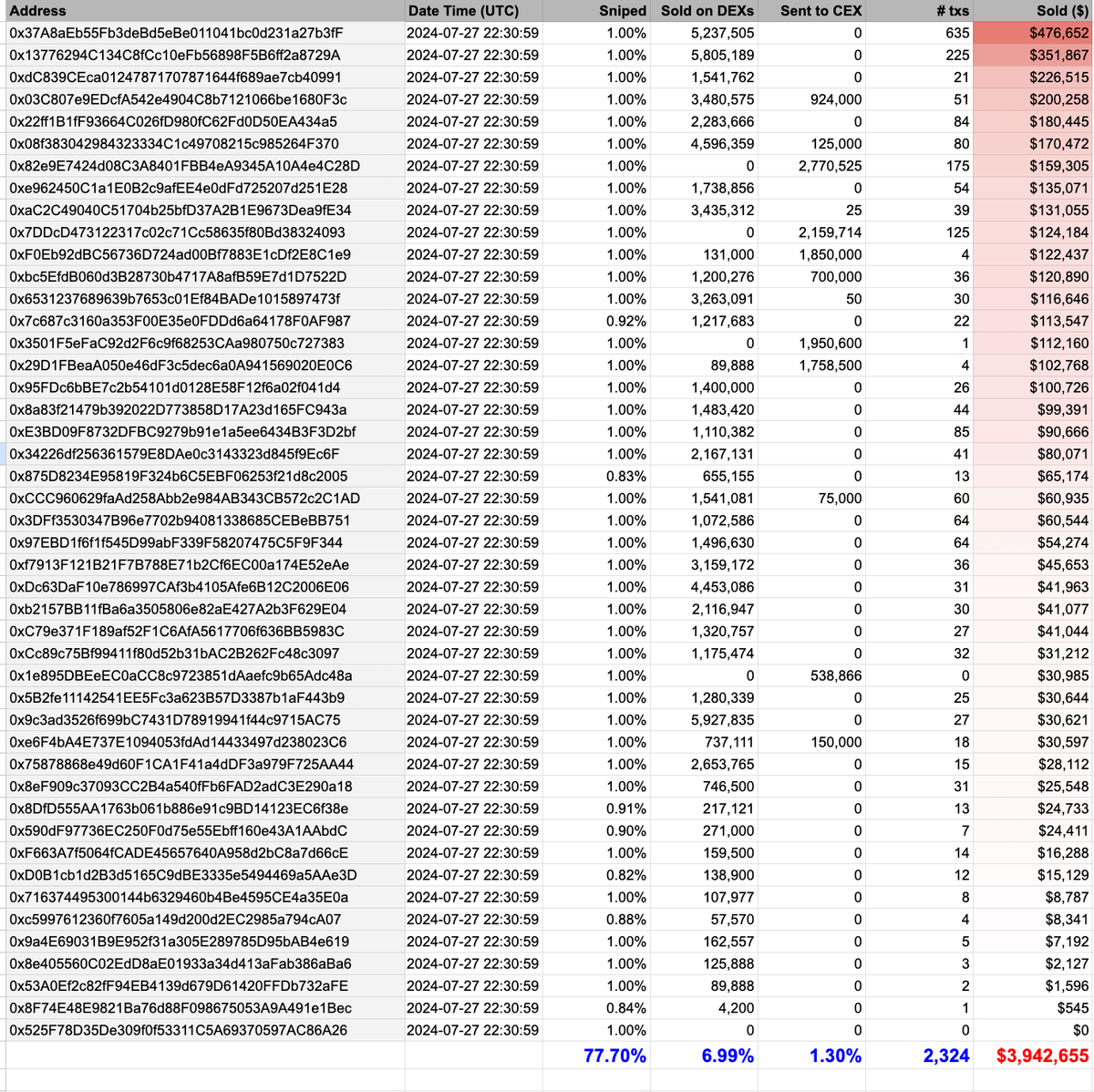 随后,在 7 月 27 日 22 点 30 分,NEIRO 发行不到 1 分钟的时间内,这些地址同时购入约 100 美元的 NEIRO(随着买入导致市值变化,每个地址的购买数量并不相同),这样短时间的大批小金额买入也让 NEIRO 代币迅速在以太坊的新代币排行榜上表现出众。随后一些专门狙击新币的机器人和做市套利机器人开始入场,迅速地“掩护”了这些内幕交易行为。