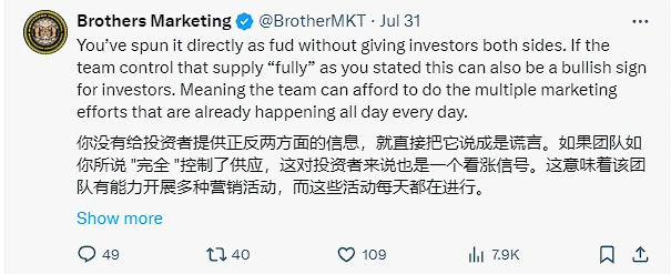 有趣的是,在 Bubblemaps 曝光 NEIRO 代币老鼠仓之后,上述喊单的多个 KOL 也出现在 Bubblemaps 的评论区里,对 Bubblemaps 进行回击,并表示团队控制代币是看涨信号。