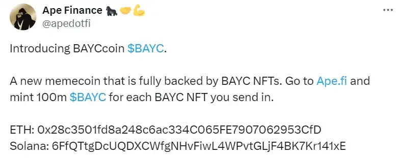 最后,在今天的凌晨 2 点 40 分,Ape Finance 终于在官推宣布 $BAYC 是他们推出的——他们甚至都不是搞「图币转换」,真的是一个存 BAYC 来兑换的 meme Token 来着...