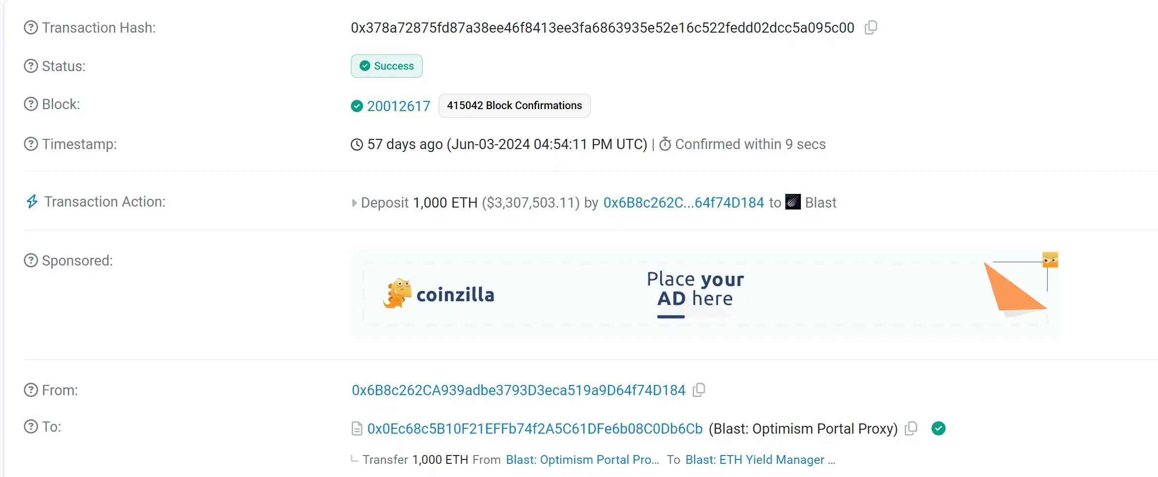 这个大户是谁小编没有能对应上,不过该地址曾往 Blast 里存过 1000 ETH。