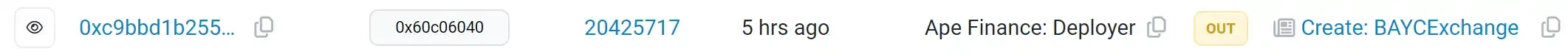 从 Etherscan 上的记录我们也可以看到,该合约的名字就是「BAYCExchange」,所以实际上「土狗」玩家误把一个 Ape Finance 推出的疑似 BAYC「图币转换」新功能当成了「土狗」在猛冲,而 0xSun 最先发现了这一点。