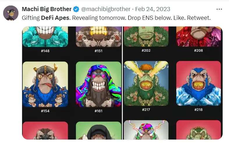 此外,该地址里还有 451 只 DeFi Apes,这就是 $BAYC 合约的部署者 Ape Finance 的 NFT 系列。NFT 玩家们估计对 DeFi Apes 都还有印象,因为在 2023 年初,「麻吉大哥」黄立成曾经疯狂宣传该项目,大家也基本上都认为这个项目背后实际就是他。