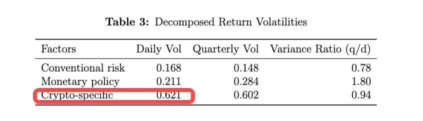 比特币的回报可以分解为三种结构性冲击:货币政策冲击、传统风险溢价冲击和加密需求冲击。(注:你可以将冲击简单理解成 XX 因素对比特币价格的影响)