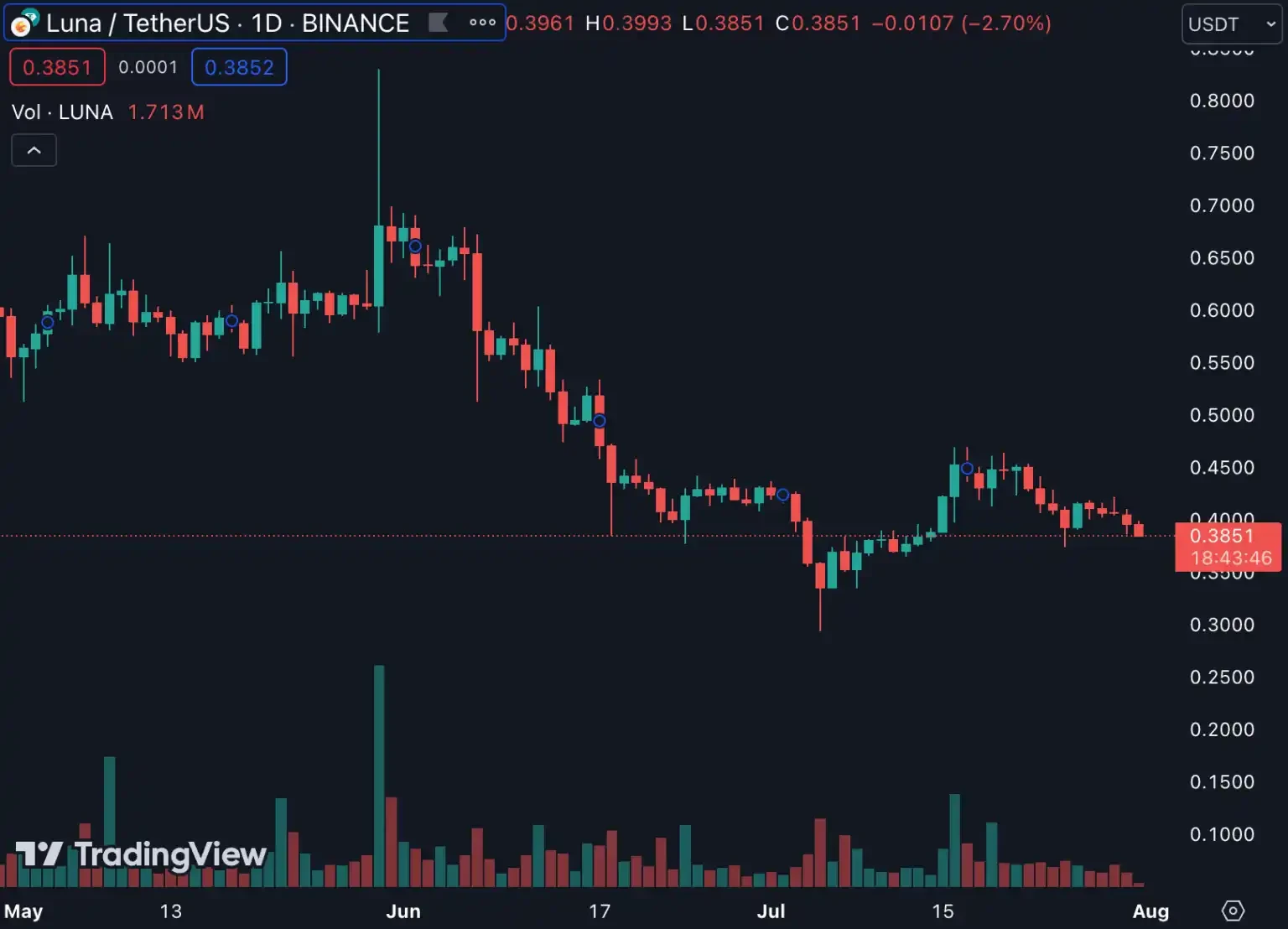 币价方面,五月底一度冲上 0.83 美元的 LUNA,近两月持续走跌,撰稿当下报 0.385 美元,距离今年高点 1.26 美元已跌去近 70% 。