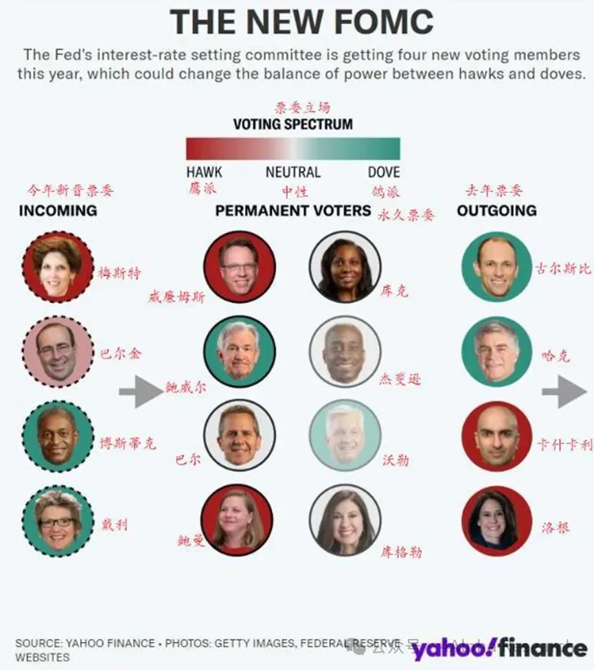地方联储中只有纽约联储主席为常驻票委,剩余四席位由其他地方联储轮值,本期为克利夫兰主席梅斯特(Loretta Mester)、里士满联储主席巴尔金(Thomas Barkin)、亚特兰大联储主席博斯蒂克(Raphael Bostic)和旧金山联储主席戴利(Mary Daly),芝加哥联储主席古尔斯比(Austan Goolsbee)、费城联储主席哈克(Patrick Harker)、明尼阿波利斯联储主席卡什卡利(Neel Kashkari)和达拉斯联储主席洛根(Lorie Logan)轮换调出。